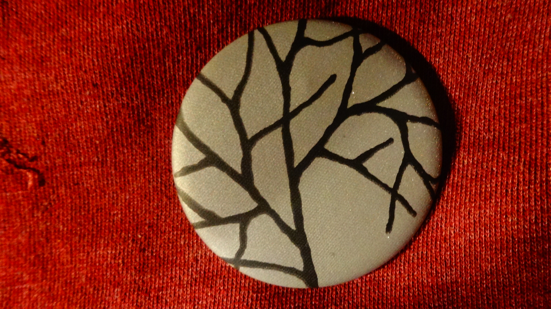 This badge came all the way from finland, from an unknown designer. It was a present from my friend Liz, who saw it and and thought of me! I ride a bike and anything reflective is always good, especially on a Critical Mass evening like tonight. This badge shines in the light, which adds to the striking branch design. The word “bradge” was coined with this one – still a badge but almost a broach…