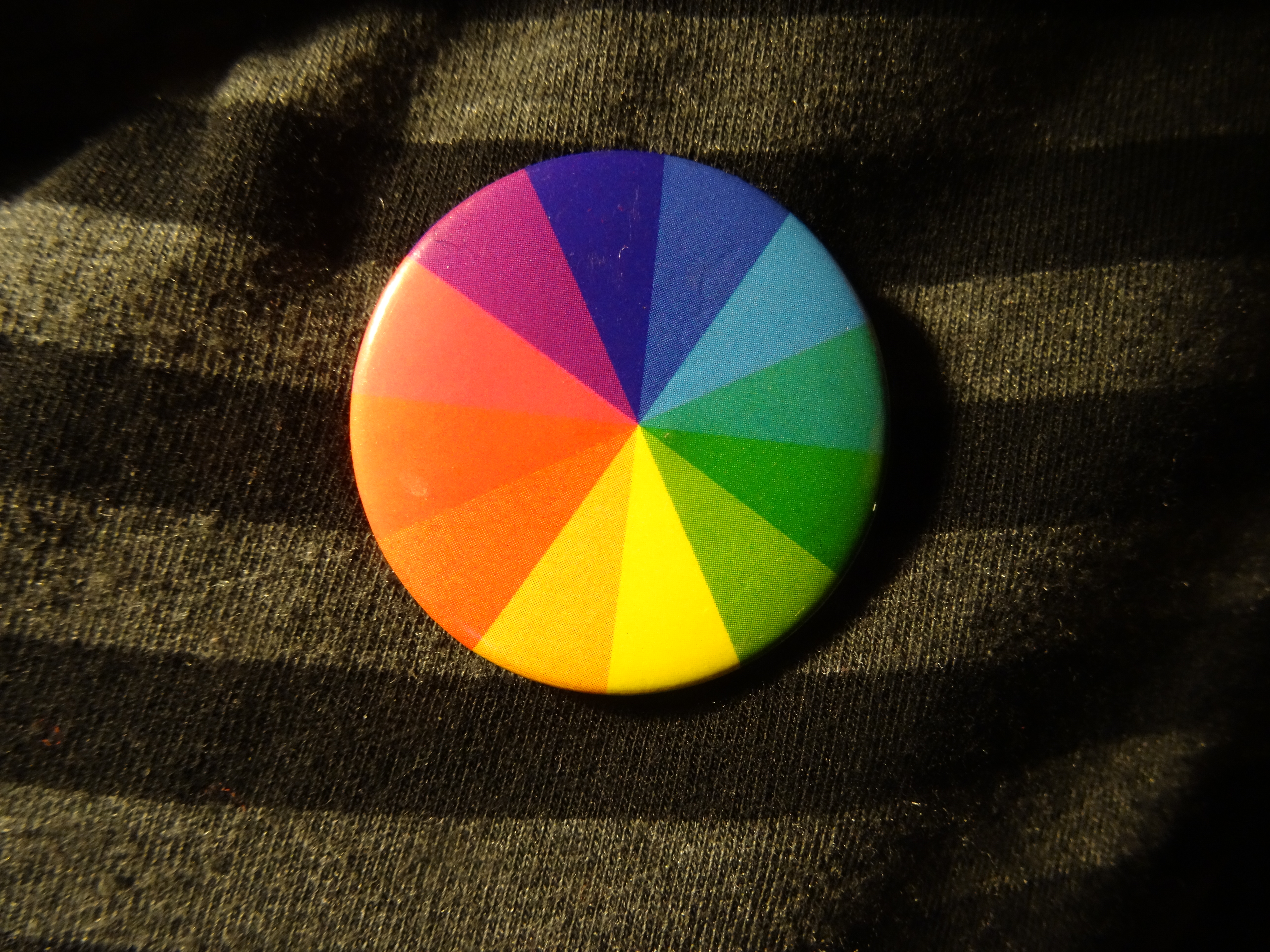 A colourful badge Today’s badge helped brighten up my monochrome outfit. It has a bold simple colour wheel design – I like that it nods to an lgbt rainbow as well. Share this: Click to share on X (Opens in new window) X Click to share on Facebook (Opens in new window) Facebook Like Loading... Related