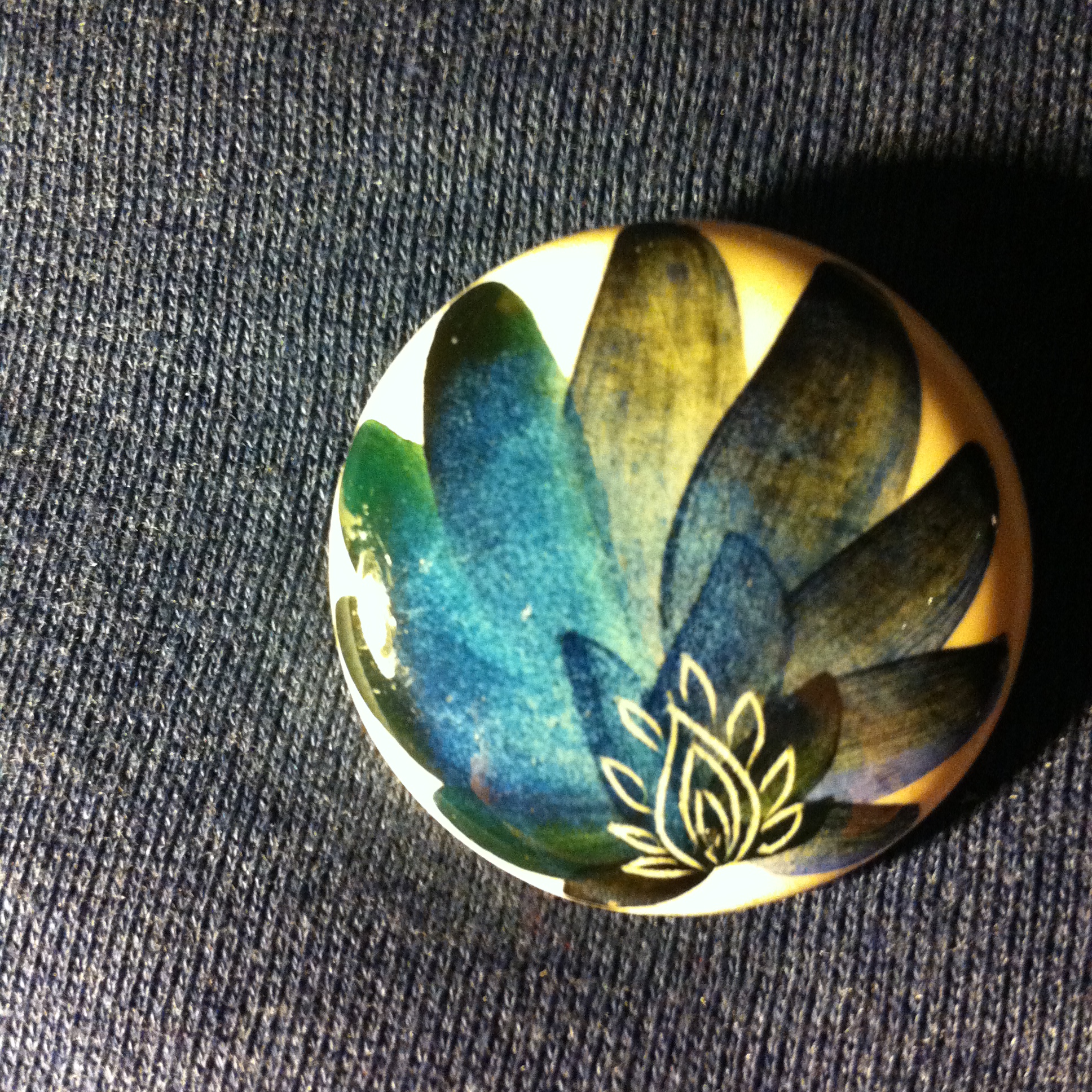 Today’s badge is an old ceramic broach. I was given it for my birthday a long time ago and I don’t wear it very often as it is quite heavy and can look quite formal. But today it was perfect for my plain blue crew neck jumper and added some glamour to an otherwise school-uniform outfit! I love the painted design swooping up from the bottom. The paint is mainly blue witth grey and gold tinges to it which sparkles in the light.